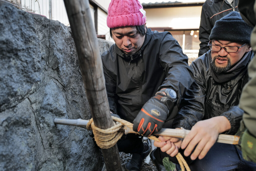 2日目は、早速刈り取った茅を使い茅葺きの手法や縄の結び方などを教えていただきつつ、垣根の制作に取り掛かります!